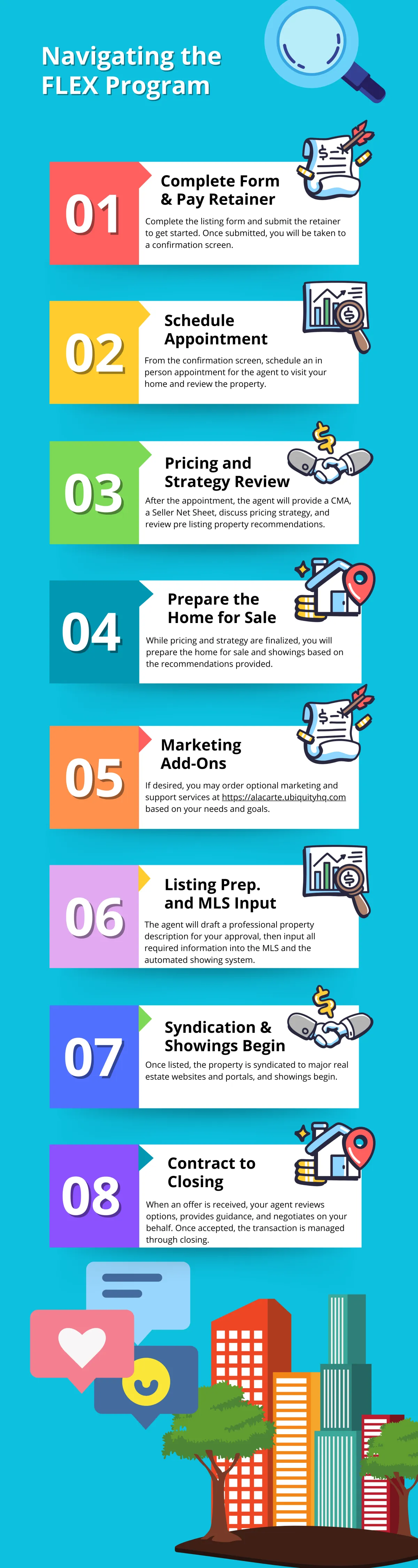 The upfront listing fee includes full representation by Ubiquity Real Estate Group, MLS input and publication, syndication to major home search sites, broker review for accuracy and compliance, automated showing request management, pricing strategy, and negotiation of offers. Additional marketing and support services are optional and selected by the seller.